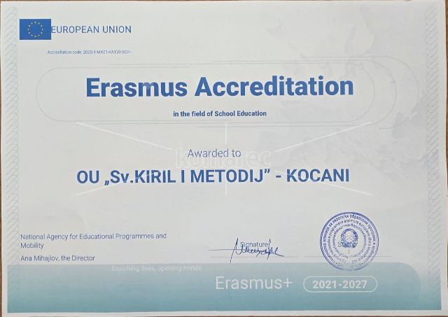 ОУ „Св. Кирил и Методиј“ – Кочани официјално доби Еразмус+ акредитација во областа на училишното образование. Ова признание отвора нови можности за развој, соработка и европски искуства за нашите ученици и наставници.