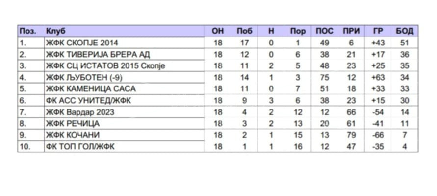 Со одигрувањето на натпреварите од 18-тото коло заврши вториот дел во Прва Фудбалска Лига за жени.